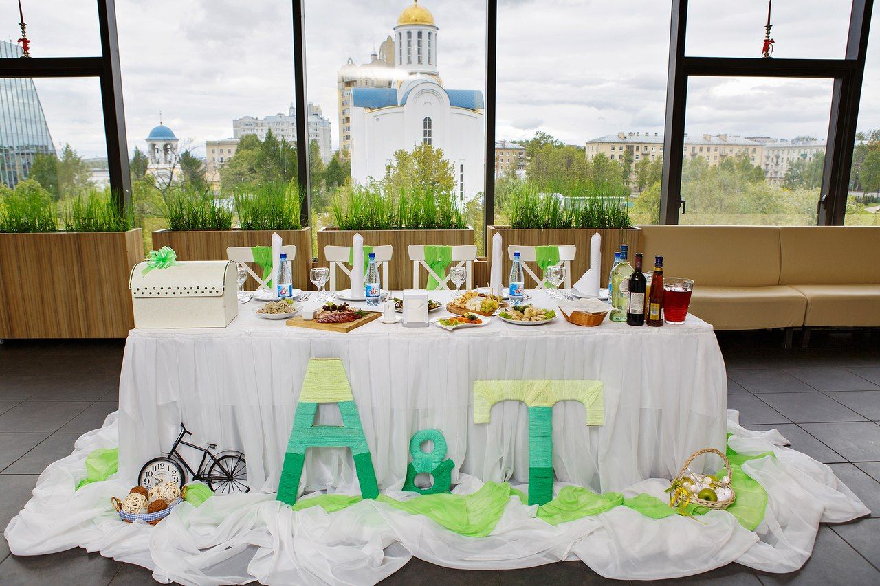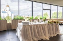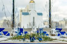 Видовой ресторан в центре Санкт-Петербурга с видом на Неву, Храм успения Святой Богородицы, Большеохтинский мост и Смольный собор.